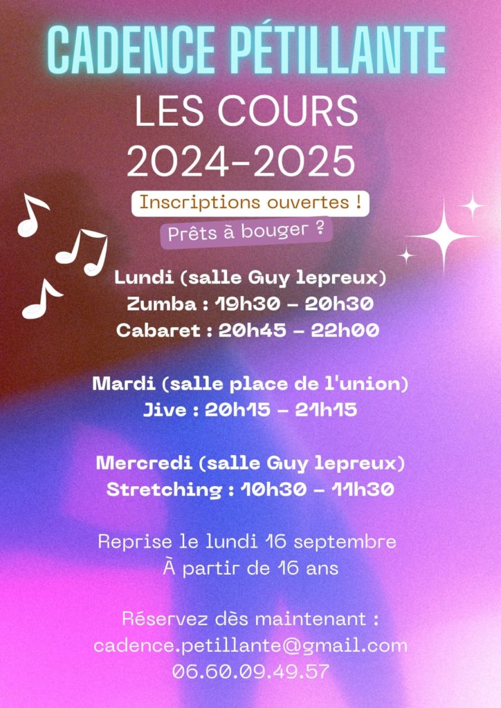 Cadence Pétillante – activités 2024/2025 Reprise des activités lundi 16 septembre. Retrouvez les infos et le planning ci-dessous PartagezTweetez0 Partages