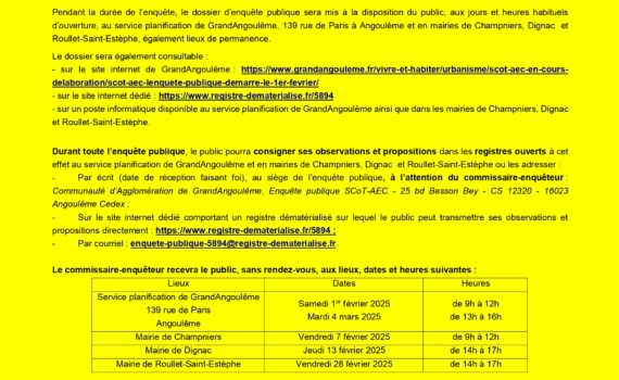 Le dossier est consultable : – sur le site internet de GrandAngoulême : https://www.grandangouleme.fr/…/scot-aec-lenquete…/ – sur le site internet dédié : https://www.registre-dematerialise.fr/5894