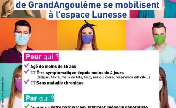 Dès le mercredi 18 novembre, des tests antigéniques de dépistage de la COVID-19 auront lieu à l’espace Lunesse à Angoulême. Plus d’infos en cliquant sur https://prendre-mon-rdv.com/lunesse-tag-angouleme/biologiste/angouleme