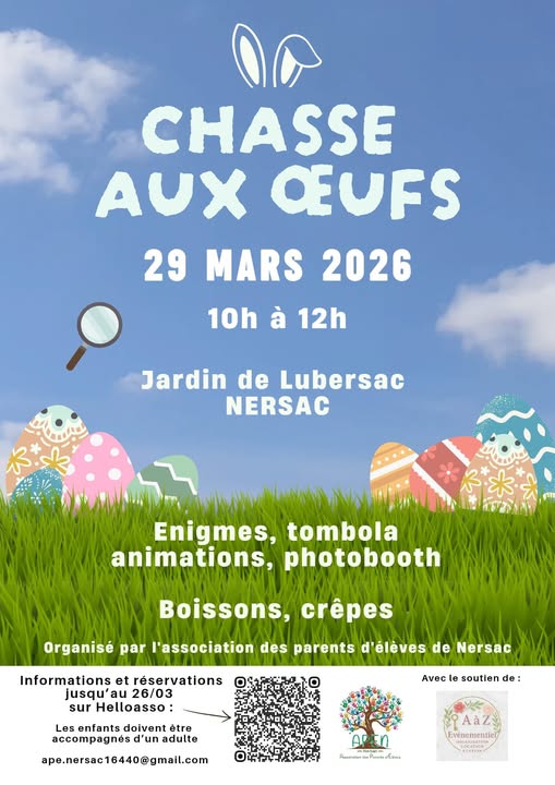 Sur réservation via le QR code sur l’affiche ou en cliquant sur http://www.helloasso.com/associations/association-des-parents-d-eleves-de-nersac-a-p-e-n/evenements/chasse-aux-oeufs