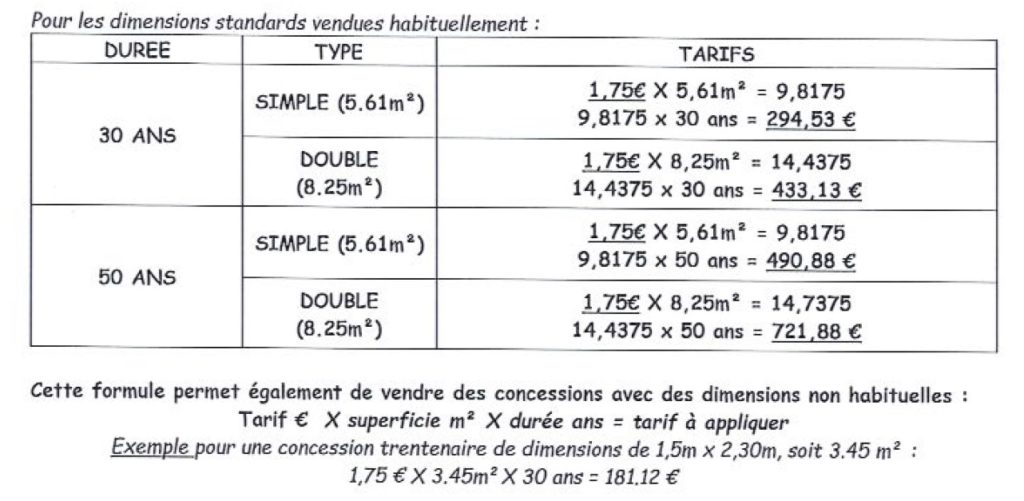 Suite à la délibération du 20 juillet 2011 décidant la fin des concessions perpétuelles et la mise en place de concessions trentenaires et cinquantenaires (au choix des familles) à compter du 1er janvier 2013, les tarifs à partir du 1er avril 2023 sont les suivants :
