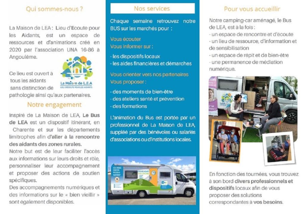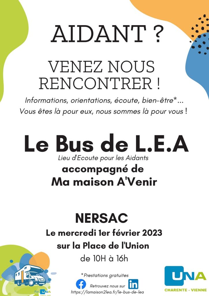 Bus L.E.A – Lieu d’écoute pour les aidants Calendrier Ajouter au calendrier Ajouter au calendrier Timely Ajouter à Google Ajouter à Outlook Ajouter au calendrier Apple Ajouter à un autre calendrier Exporter vers XML Quand : 1 février 2023 Jour entier 2023-02-01T00:00:00+01:00 2023-02-02T00:00:00+01:00 Divers PartagezTweetez0 PartagesVous êtes un proche aidant ou accompagnant ? Ceci peut vous intéresser !! Le bus de L.E.A. (Lieu d’Écoute pour les Aidants) s’installe sur la place de l’Union à Nersac, le mercredi 1er février de 10h00 à 16h00. Pour plus d’informations, veuillez consulter le flyer ci-dessous. PartagezTweetez0 Partages