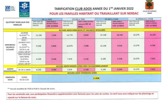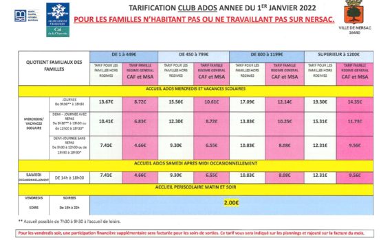 Tarifs club ados 2022 hors commune