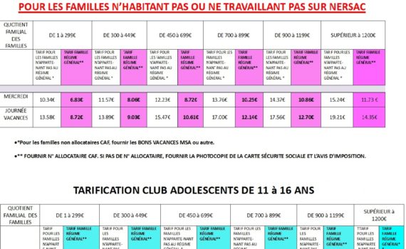 Retrouvez ici tous les tarifs de la commune de Nersac pour l’année 2024.
