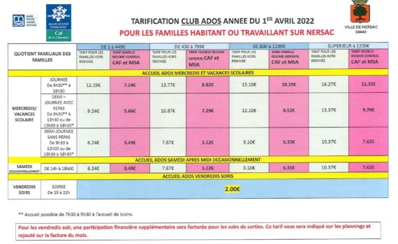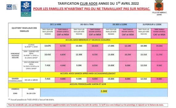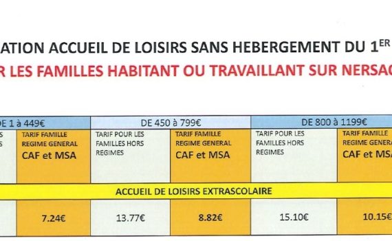 Retrouvez ici tous les tarifs de la commune de Nersac pour l’année 2024.