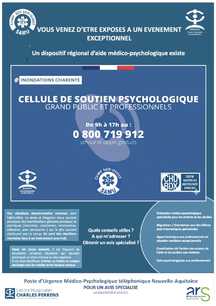 Dans le contexte des crues en cours sur le département, une cellule de soutien psychologique est activée afin d’accompagner les administrés touchés par cet événement.